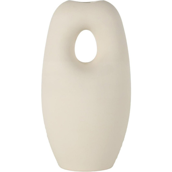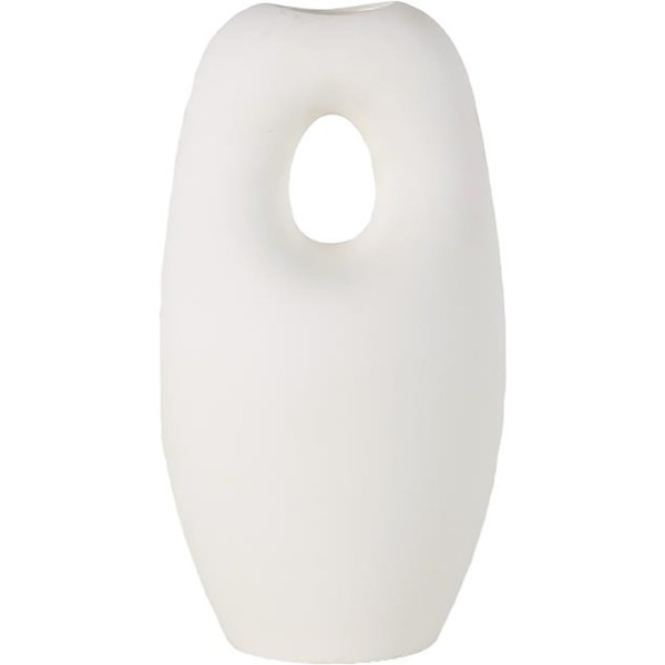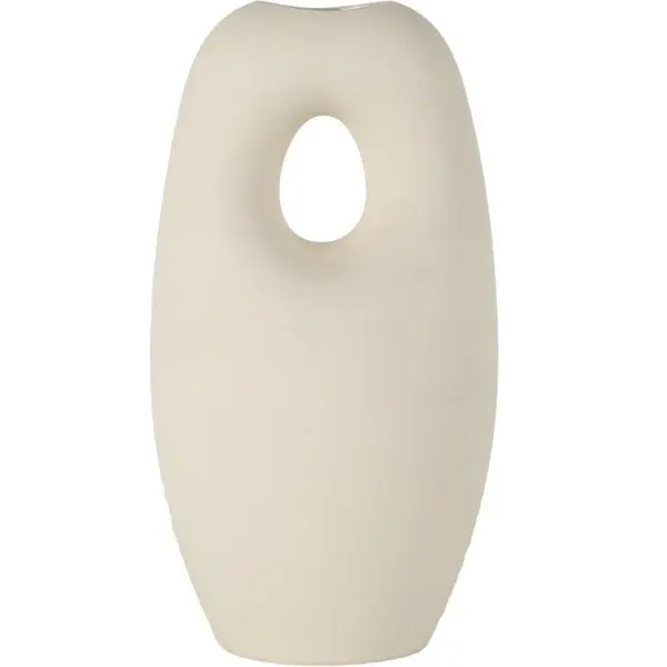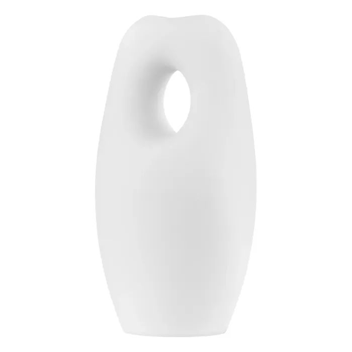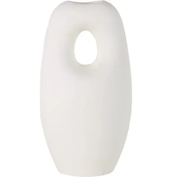 Вазу серії Midori молочного кольору виготовлено з порцеляни, яка вирізняється міцністю та витонченістю. Виріб має скульптурну форму з наскрізним отвором і нестандартним силуетом, що привертає увагу з першого погляду. Розмір 12,7 × 10 × 23 см створює візуальний баланс між компактністю та виразністю. Гладенька поверхня підкреслює чистоту форм і сучасний характер. Миття в посудомийній машині допомагає зберігати первинний вигляд без зайвих зусиль.