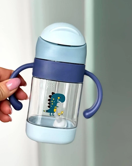 Поїльник непроливайка 300 мл з силіконовою трубочкою з ручками Динозавр Блакитний PKD-09
