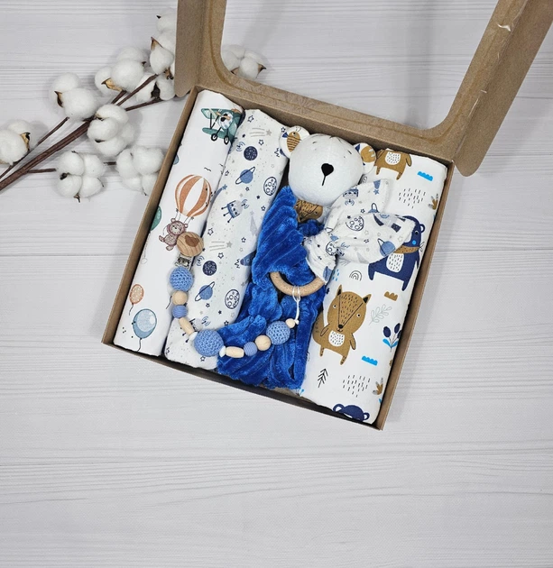 Набір для новонародженого: 3 пелюшки і гризунець з тримачем a.l.babybox Лісові мешканці на галявині Блакитний