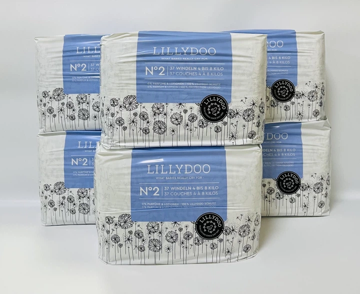 Набір з 6 уп по 37 штук (разом 222 штук) підгузків дитячих Lillydoo 2 розміру, 4-8кг