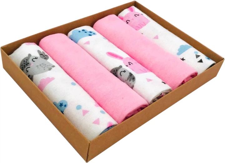 Набір дитячих фланелевих міні пелюшок-рушників BabySoon Зайчики рожеві та совоньки + блакитний однотон 30х35 см 5 шт. (ФП-08