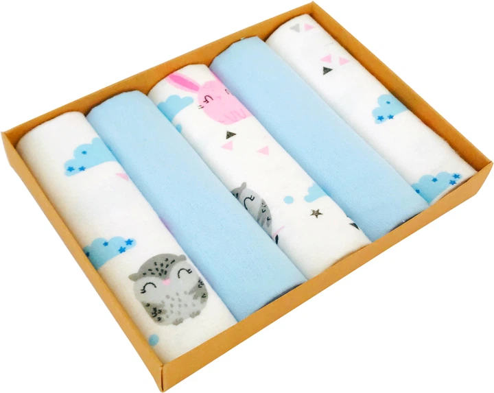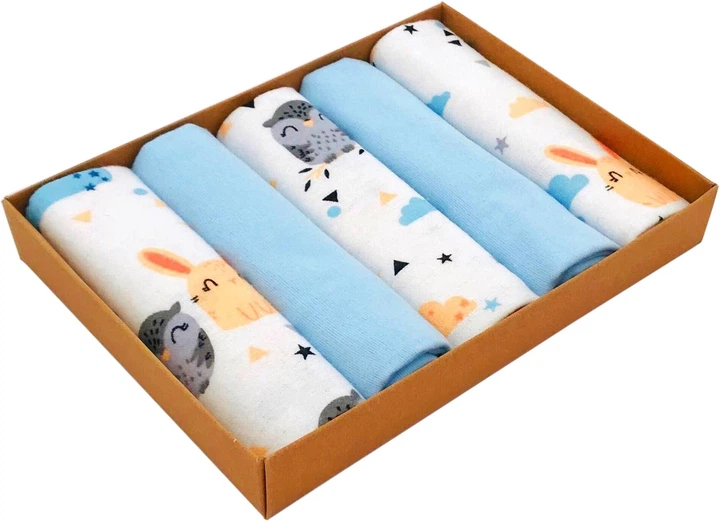 Набір дитячих фланелевих міні пелюшок-рушників BabySoon Зайчики блакитні та совоньки + блакитний однотон 30х35 см 5 шт. (ФП-