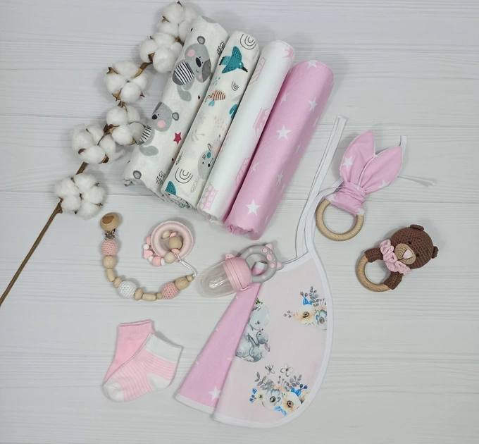 Набір для новонародженого: 6 пелюшок та гризунець з тримачем a.l.babybox Мамині обійми