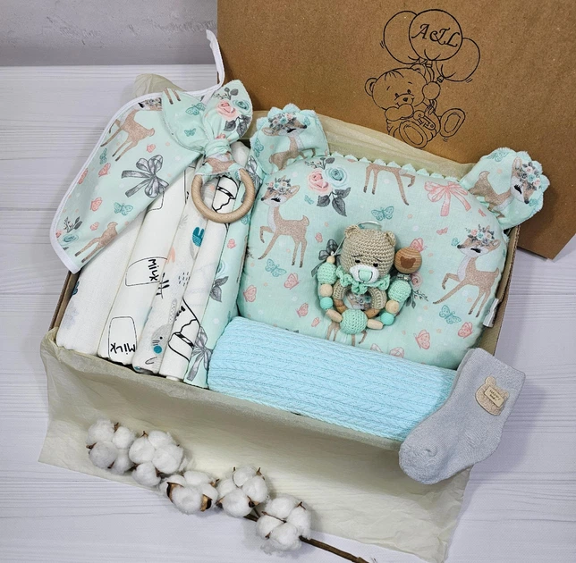 Набір для новонародженого: подушка, пелюшки і іграшки з пледом a.l.babybox М'ятні козулі