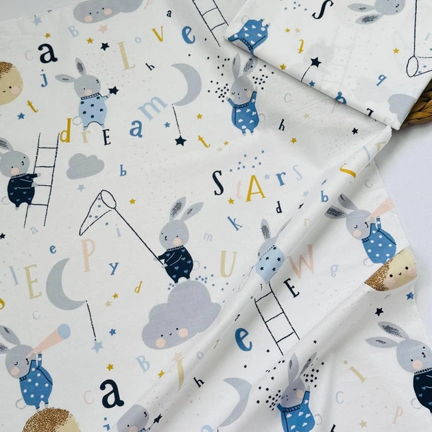 Пелюшка бавовняна багаторазова для новонародженого 90х80 см зайчик з буквами біла з блакитним малюнком