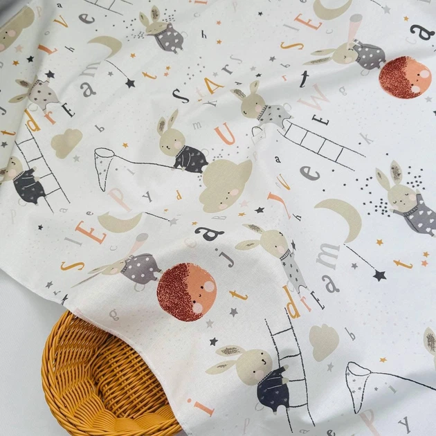 Пелюшка бавовняна багаторазова для новонародженого 90х80 см зайчик з буквами біла з зеленим малюнком