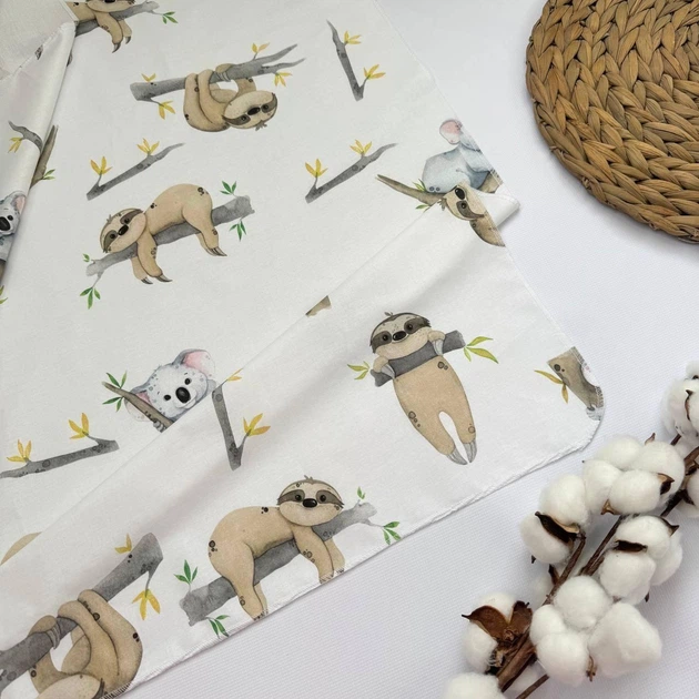 Пелюшка бавовняна багаторазова для новонародженого 90х80 см ліниві лінивці та коали на гілочках біла з малюнком