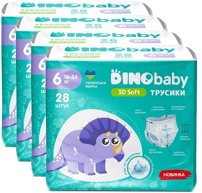 Підгузки-трусики, 6 (16-24кг), 4x28 шт. - Dino Baby 3D Soft 112шт.