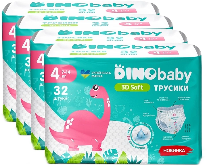 Підгузки-трусики, 4 (7-14кг), 4x32 шт. - Dino Baby 3D Soft 128шт.