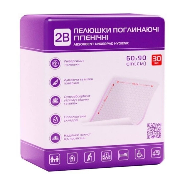 Пелюшки одноразові гігієнічні, що вбирають 2B 60 см х 60 см, 30 шт.