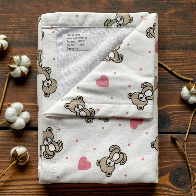 Пелюшка непромокаюча фланелева 50 х 70 см Ведмедик і сердечки рожеві