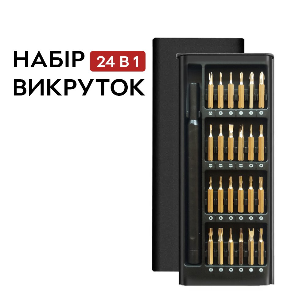 Набір викруток для телефону, комп'ютера, ноутбука та іншої електроніки – незамінна річ у сучасний цифровий час. Розібрати щось дрібне звичайними інструментами не завжди вдасться. Тому набір викруток для дрібних робіт зараз користується великою популярністю. Набір міні викруток містить 24 різних насадки: плоска викрутка (SL), хрестова (PH), зіркоподібна (TORX), шестигранна (HEX),