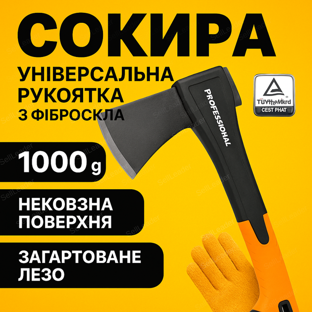 Сокира professional 1000г для дров топірець кована сталь універсальна колун скловолокно антиковзна 45см