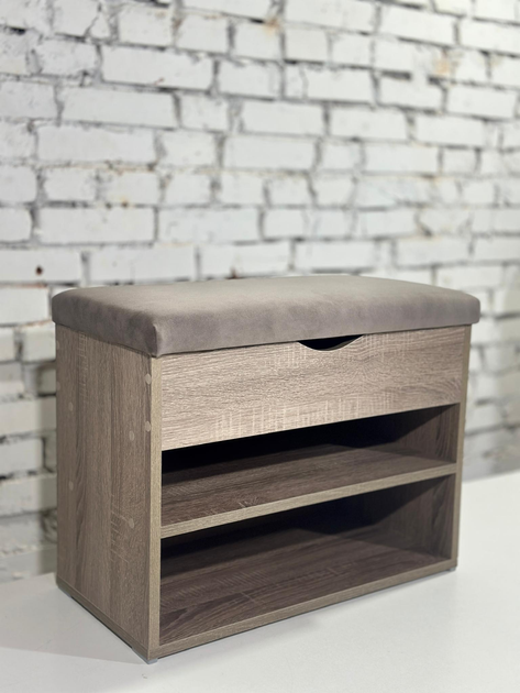 Стелаж для взуття відкритий з ящиком і м'яким верхом. ДСП сонома трюфель шириною 90 см. Тканина - світло сіра