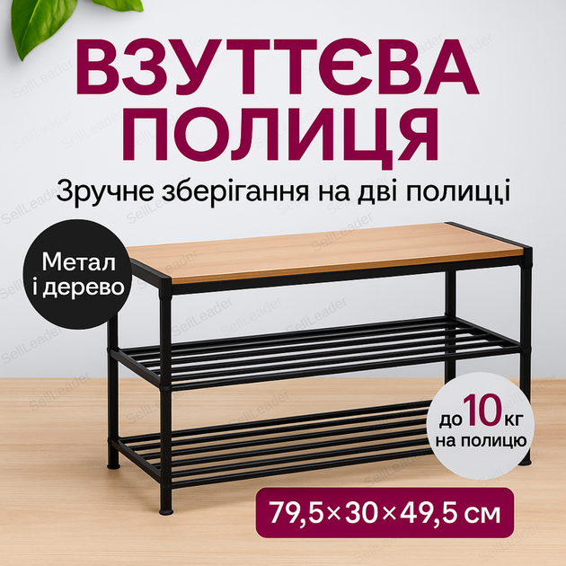 Стелаж для взуття метал та дерево взуттєва полиця 2 яруси підлогова 79,5х30х49,5 см в передпокій чорна