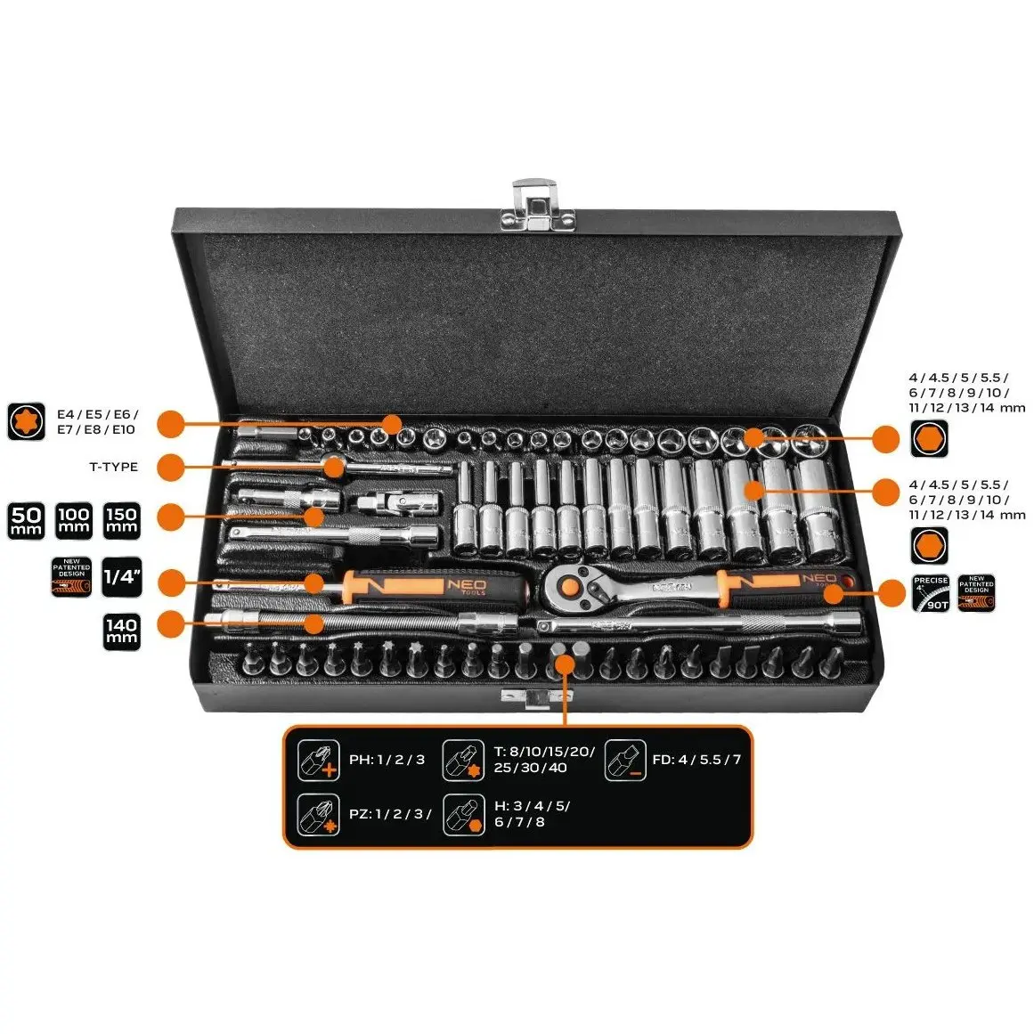 Neo Tools Набір інструментів, Набір торцевих головок, 63шт, 1/4", CrV, металевий кейс