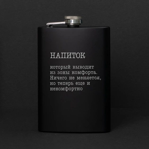 Фляга "Напій, що виводить із зони комфорту", російська, Дерев'яна подарункова коробка з гравіюванням