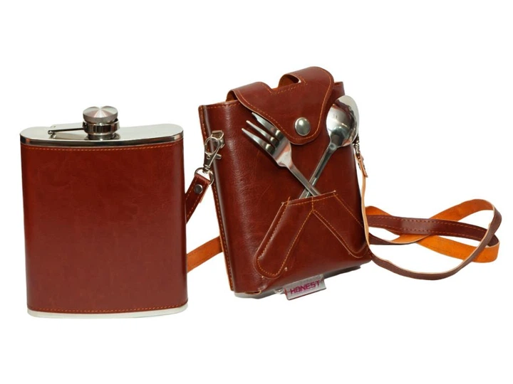 Набір похідний Brown Skin Brown фляга 532ml ложка виделка в шкіряному чохлі