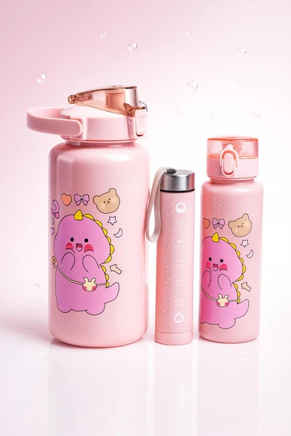 Набір багаторазових пляшок для води 3 в 1 Дракоша 0.3 л, 0.7 л, 2 л рожевий