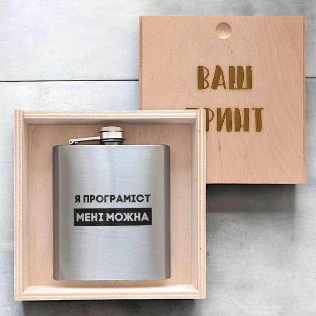 Фляга сталева "Я програміст мені можна" у дерев'яній подарунковій коробці з гравіюванням