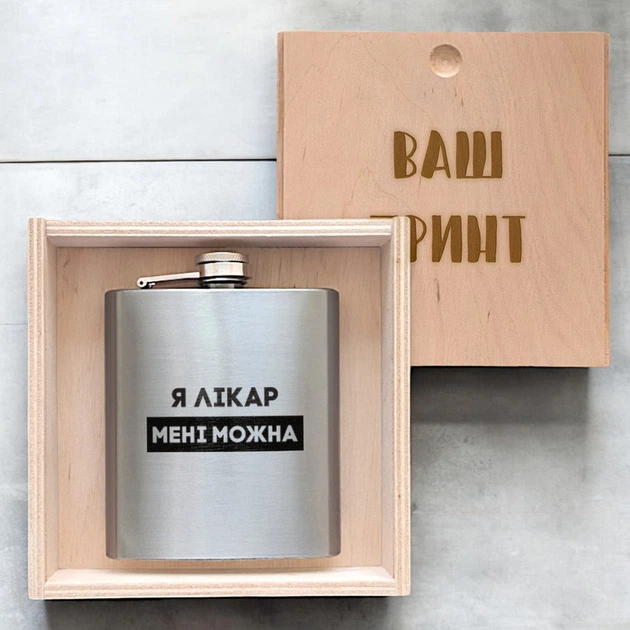 Фляга сталева "Я лікар мені можна", російська, Дерев'яна подарункова коробка з гравіюванням 5034635