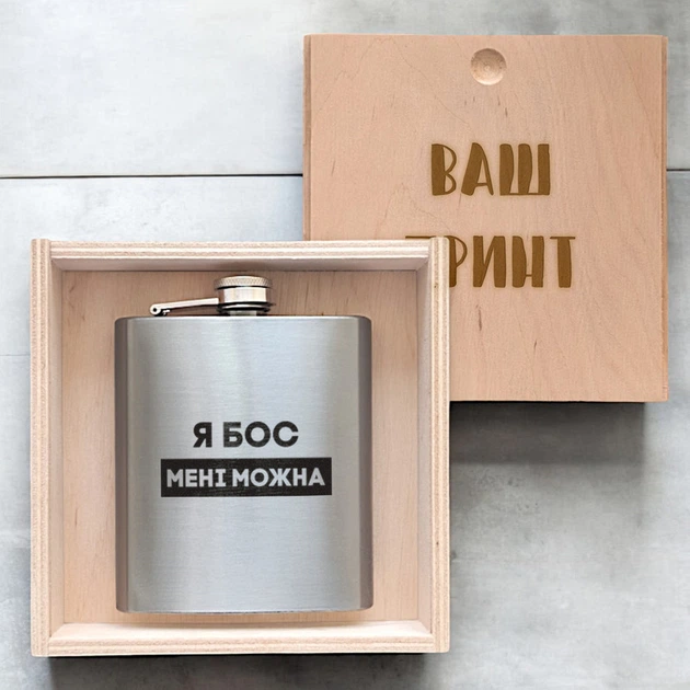 Фляга сталева "Я бос мені можна" у дерев'яній подарунковій коробці з гравіюванням 4940876