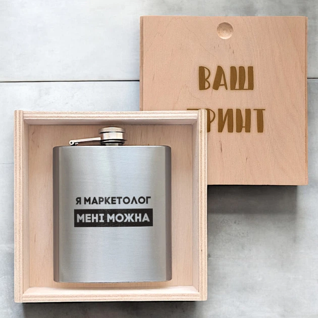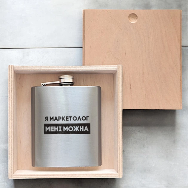 Фляга сталева "Я маркетолог мені можна" у дерев'яній подарунковій коробці з гравіюванням