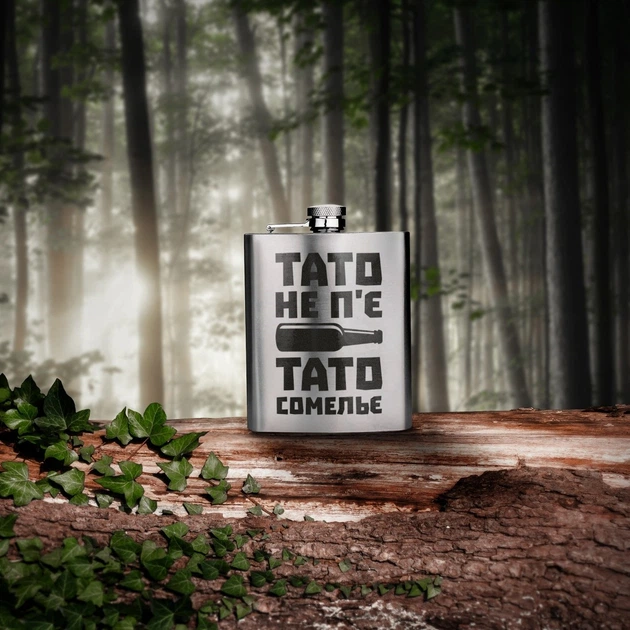 Фляга сталева "Тато не п'є. Тато сомельє", українська, Дерев'яна подарункова коробка з гравіюванням 5034591