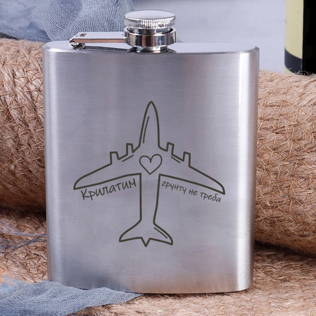 Фляга сталева "Крилатим грунту не треба", українська, Дерев'яна подарункова коробка з гравіюванням