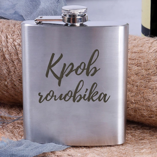 Фляга сталева "Кров чоловіка", українська, Дерев'яна подарункова коробка з гравіюванням