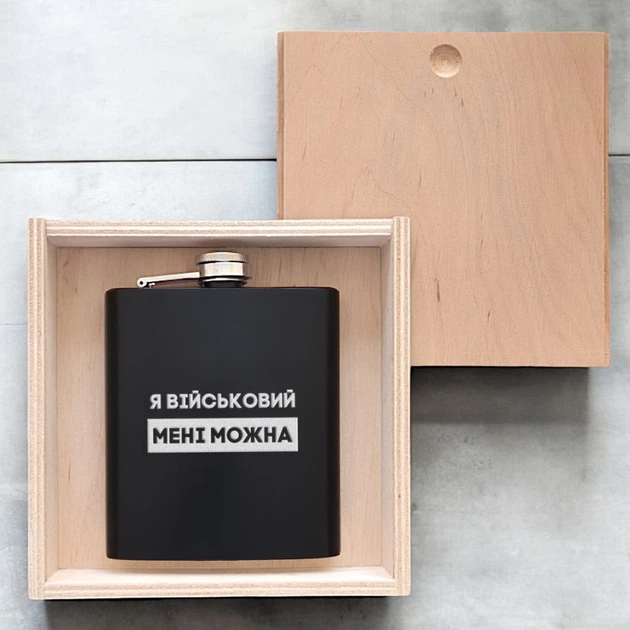 Фляга "Я військовий мені можна" у дерев'яній подарунковій коробці з гравіюванням 4940938