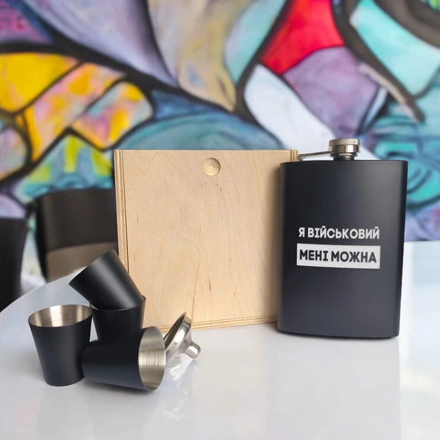 Набір чорна фляга з чарками "Я військовий мені можна" у подарунковій коробці з гравіюванням 4940822