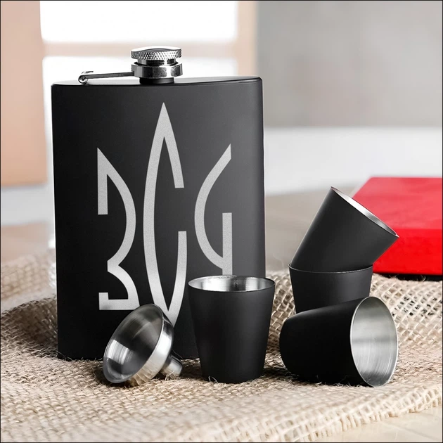 Набір чорна фляга з чарками "ЗСУ Герб" , Крафтова коробка