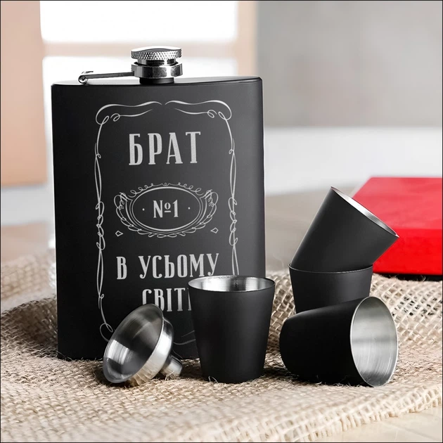Набір чорна фляга з чарками "Брат №1 у всьому світі" в крафтовій коробці 4822480