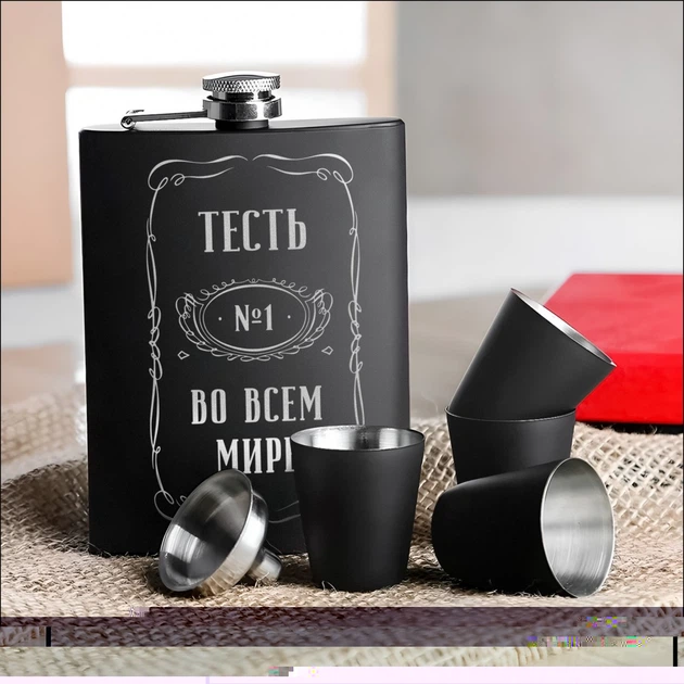 Набір чорна фляга з чарками "Тесть №1 в усьому світі" у крафтовій коробці