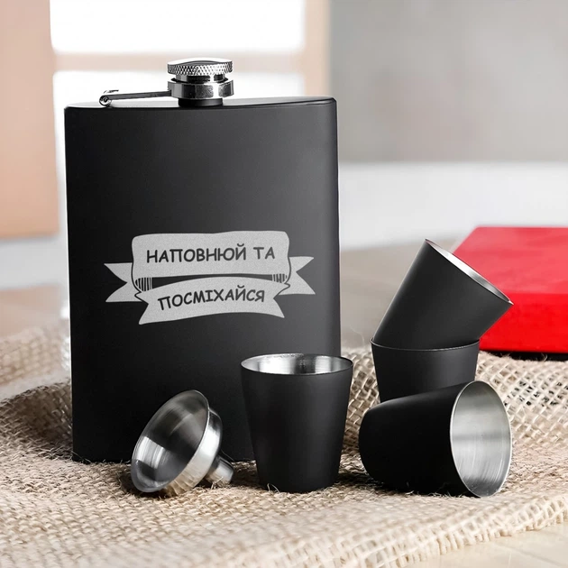 Набір чорна фляга з чарками "Наповнюй та посміхайся" у крафтовій коробці