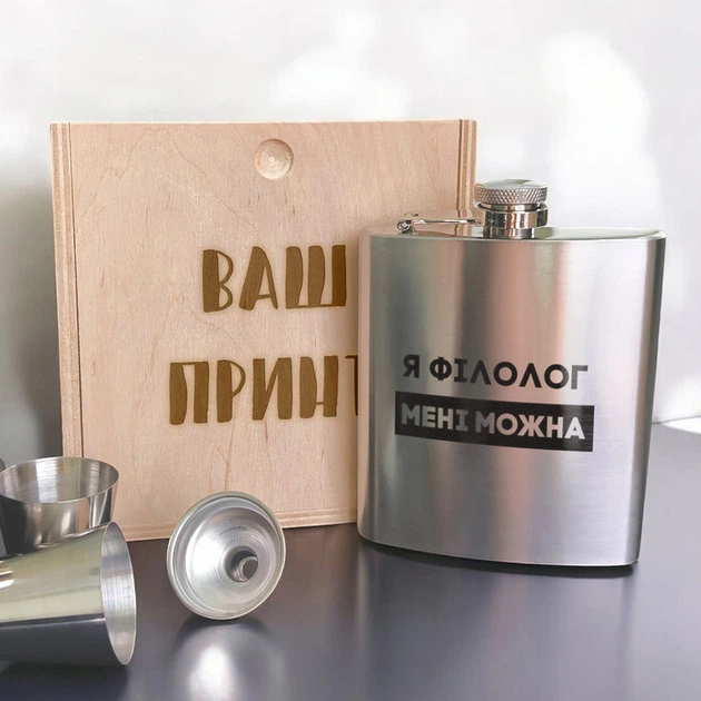 Набір фляга з чарками "Я філолог мені можна" у подарунковій коробці з гравіюванням 4940723