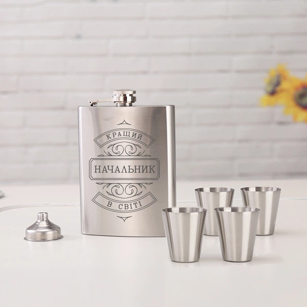 Набір фляга з чарками "Кращий начальник у світі" у дерев'яній подарунковій коробці з гравіюванням