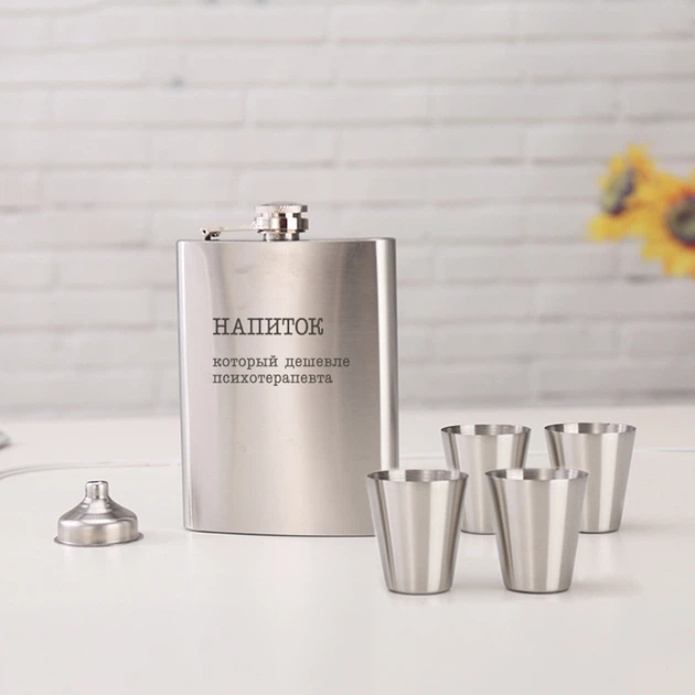 Набір фляга з чарками "Напій, який дешевше за психотерапевта" BeriDari (BD-FLASK-116)