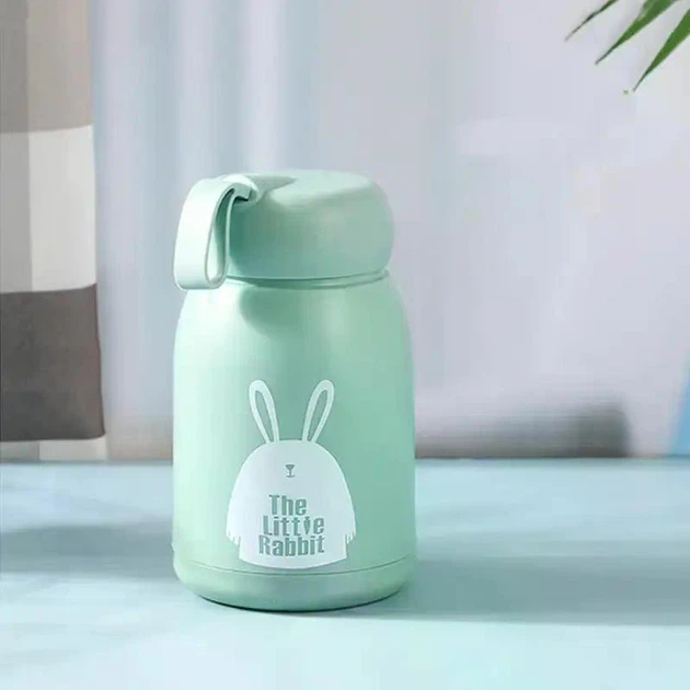Пляшка для води дитяча із зображенням кролика, термостійка, з ручкою для перенесення, 330 мл. Мята