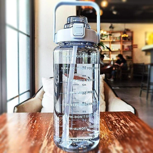 Пляшка для води дорожня 2 л прозора блакитна з розміткою з трубочкою