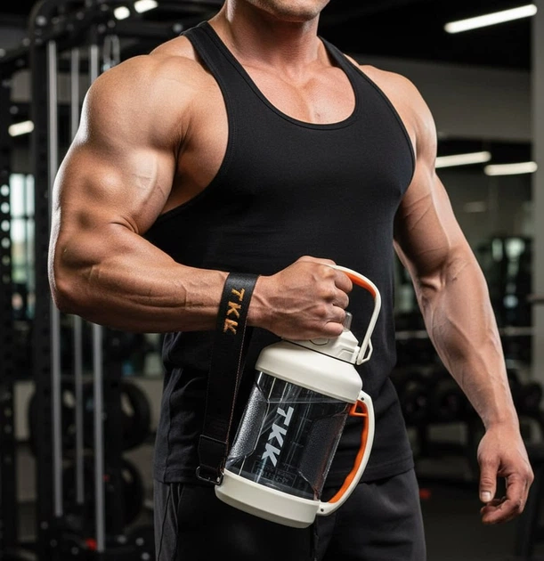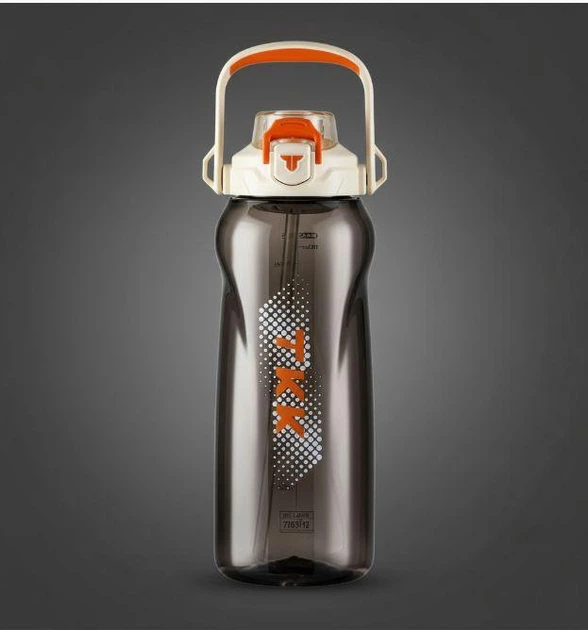 Пляшка для води TKK спортивна 2000 мл з соломинкою, ручкою та ремінцем, герметична пластикова. Сіра