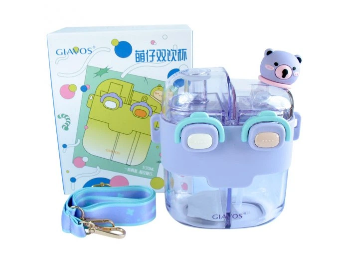 Пляшка для води на 2 секції з трубочкою дитяча Ведмедик (фіолетова), 530 мл, JG2582