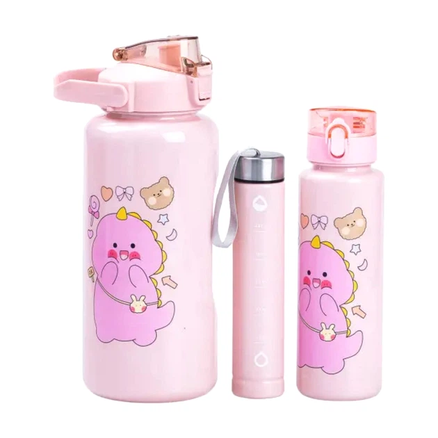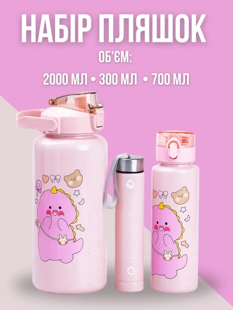 Набір багаторазових пляшок 3 в 1 "Дракоша" 0.3 л, 0.7 л, 2 л, Ємність для пиття в школу, Рожевий