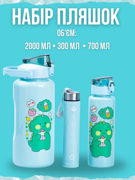 Набір багаторазових пляшок 3 в 1 Дракоша 0.3л, 0.7л, 2л синій, Комплект для води, Багаторазові ємності для напоїв для спорту