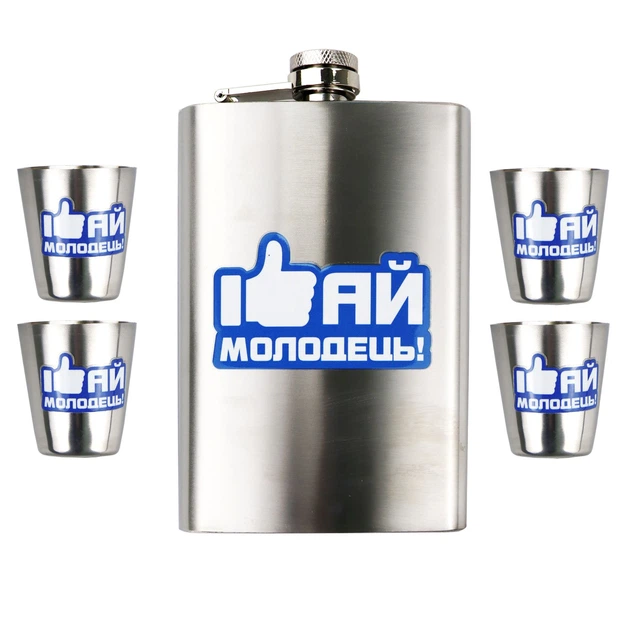 Набір ТМ 4Profi Фляга Срібло + чотири чарки + лійка, з налипкою 9oz 256 мл "АЙ Молодець"
