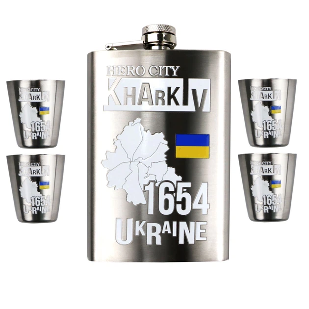 Набір ТМ 4Profi Фляга Срібло + чотири чарки + лійка, з налипкою 9oz 256 мл "Kharkiv 1654"