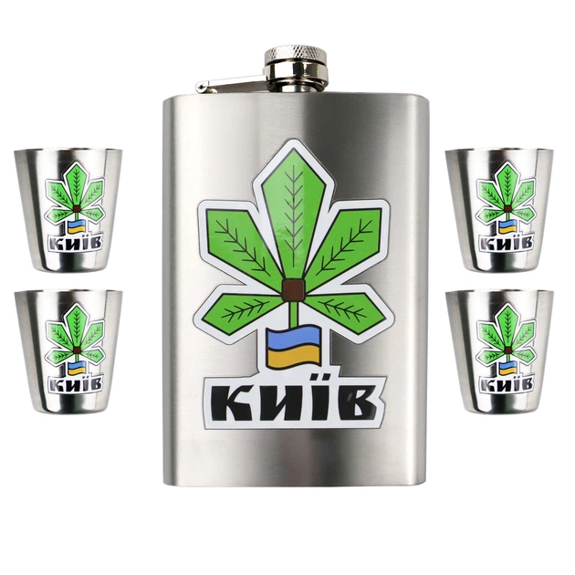 Набір ТМ 4Profi Фляга Срібло + чотири чарки + лійка, з налипкою 9oz 256 мл "Київ"