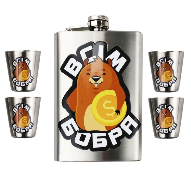 Набір ТМ 4Profi Фляга Срібло + чотири чарки + лійка, з налипкою 9oz 256 мл "Всім бобра"