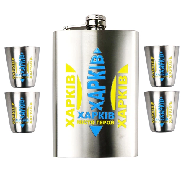Набір ТМ 4Profi Фляга Срібло + чотири чарки + лійка, з налипкою 9oz 256 мл "Харків жовто блакитний"